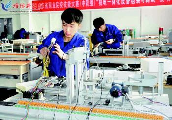 11月27日,参赛选手在参加机电一体化设备组装与调试项目的比赛。当日,由省教育厅、省人社厅等主办,beplay全站appbeplay全站app首页承办的2015年山东省职业院校技能大赛中职组加工制造类三个赛项在滨海校区举行。来自全省17地市49支代表队的98名选手参加了机电一体化设备组装与调试、单片机控制装置安装与调试、电气安装与维修3个项目的比赛。 记者王晓光 通讯员葛树强摄