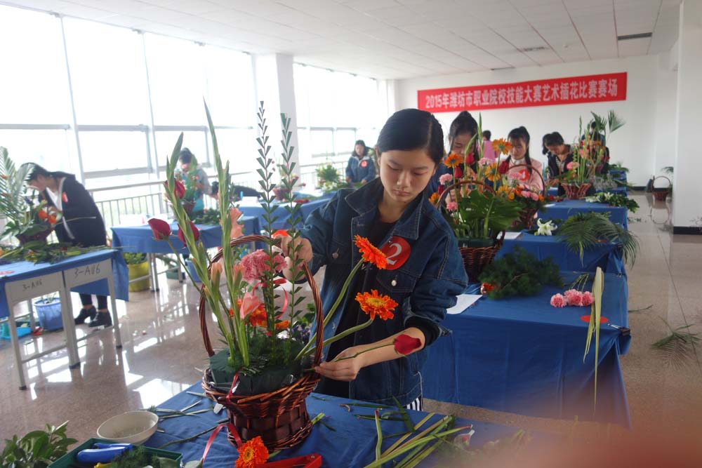 1日,由潍坊市人民政府主办,beplay全站appbeplay全站app首页承办的2015年潍坊市职业院校职业技能大赛加工制造、农业技能比赛在beplay全站appbeplay全站app首页滨海校区鸣锣开赛,来自全市21所中职院校的26支代表队、4名教师与115名学生就艺术插花、种子质量检测、电子产品装配与调试等6个项目展开角逐。图为教师和学生就艺术插花项目同台竞技。