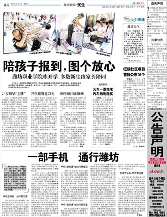 [潍坊晚报]beplay全站appbeplay全站app首页昨开学,多数新生由家长陪同