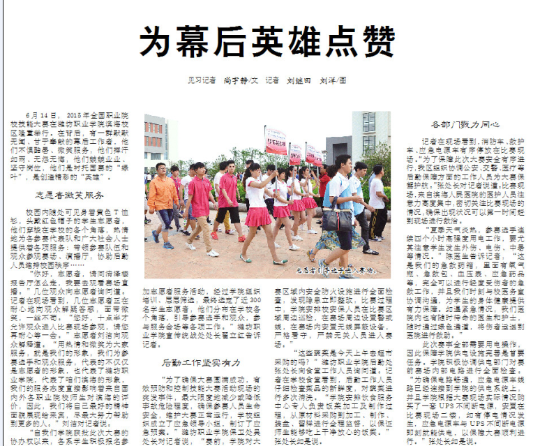 6月14日,2015年全国职业院校技能大赛在beplay全站appbeplay全站app首页滨海校区隆重举行,在此期间,我们看到了比赛现场、赛事直播间一幅幅精彩、激烈的画面。在这精彩的背后有着一群默默无闻,甘于奉献的幕后工作者,他们不惧酷暑,微笑服务,他们挥汗如雨,无怨无悔,他们兢兢业业,坚守在各自岗位,他们是衬托国赛的“绿叶”,是创造精彩的英雄,是最可爱的人!