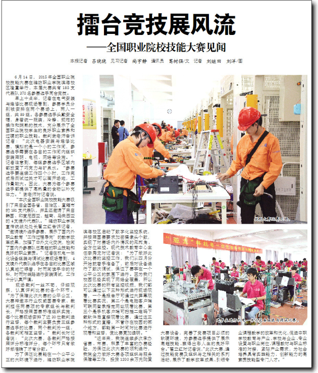 本报讯 6月14日,2015年全国职业院校技能大赛中职组电气安装与维修、机电一体化设备组装与调试两个赛项在beplay全站appbeplay全站app首页滨海校区举行。本届大赛共吸引了国内外185支代表队370名参赛选手同台竞技,比赛采用团队方式进行,历时四个小时。这是首次邀请境外代表队来参加比赛。