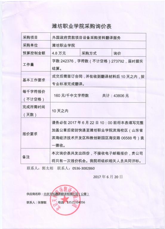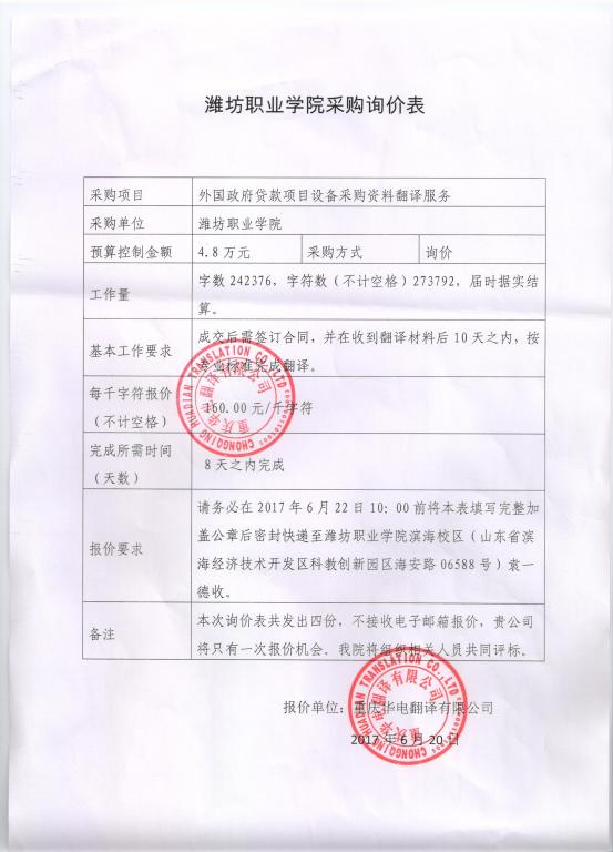 2017年6月20日,我单位以电子邮件方式向北京天和嘉译翻译有限公司、重庆华电翻译有限公司、北京天和汇佳翻译有限公司和重庆柯美翻译有限公司发出询价函,请四家公司于6月22日10时前以书面形式报价并密封特快传递至beplay(中国)招投标管理办公室。6月23日上午10:00前收齐四家公司的报价快递。6月23日下午在院纪委同志监督下,开启报价函。根据报价情况,现确定北京天和嘉译翻译有限公司和重庆华电翻译有限公司为入围单位。