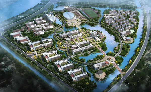 3.楼名,包括15座单体楼和两个组团:1号行政楼;2、3号教学楼;4号图书馆、5号培训中心; 10号餐厅楼;11、12、13号实训楼;14、15号中试基地;16、17号实训车间;18号体育馆;19号游泳馆;6、7、8、9号学生公寓楼组团;教师公寓组团。