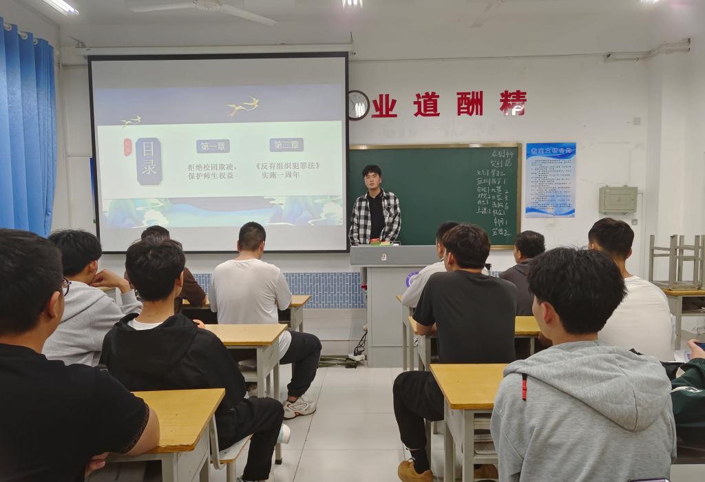 此次班会以班级为单位开展。班会上,各班班长向同学们详细讲解了《反有组织犯罪法》的制定背景及基本内容,并通过实际案例解答了“如何预防有组织犯罪”和“遇到有组织犯罪怎么办”等方面问题,让同学们深刻认识到组织犯罪的危害。同时还围绕防止校园欺凌向同学们详细讲解了校园欺凌的常见类型、存在的原因以及所带来的负面影响,引导同学们正确地面对和防范校园欺凌。在班会中学生们积极思考,踊跃提问,现场学习氛围浓厚,气氛活跃,大家纷纷表示要提高法律意识和安全防范意识,主动检举揭发违法犯罪,用合法的方式去解决校园欺凌,争做尊法、学法、守法、用法的新时代青年。
