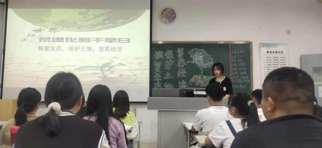宣传活动中各班通过主题班会、视频、手抄报等给同学们讲解了世界荒漠化和干旱日的由来以及世界荒漠化的严峻形势,防沙治沙等荒漠化防治知识,展示了中国近年来在生物多样性保护、生态环境治理和荒漠化防治等方面取得的显著成效。