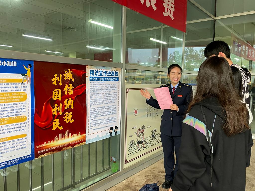 4月22日上午,财务处邀请国家税务总局潍坊市滨海经济技术开发区税务局相关专家到我校,开展以“税法进校园”为主题的税收法律宣传活动。