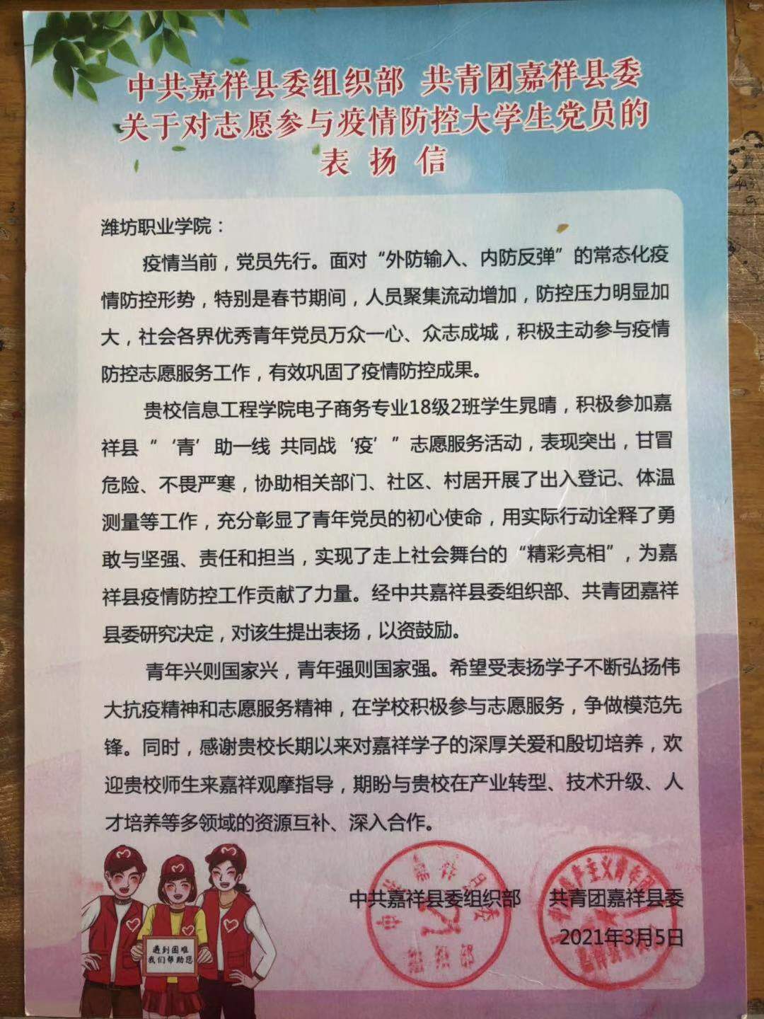 近日,信息工程beplay(中国)团总支收到中共嘉祥县委组织部、共青团嘉祥县委送来的一封感谢信,感谢我院2018级电子商务2班晁晴同学在春节期间积极主动参加疫情防控志愿服务工作。一封感谢信,不仅是潍职学子在用实际行动诠释勇敢与坚强、责任与担当,更是“崇实尚行 敢于争先”潍职精神的体现。