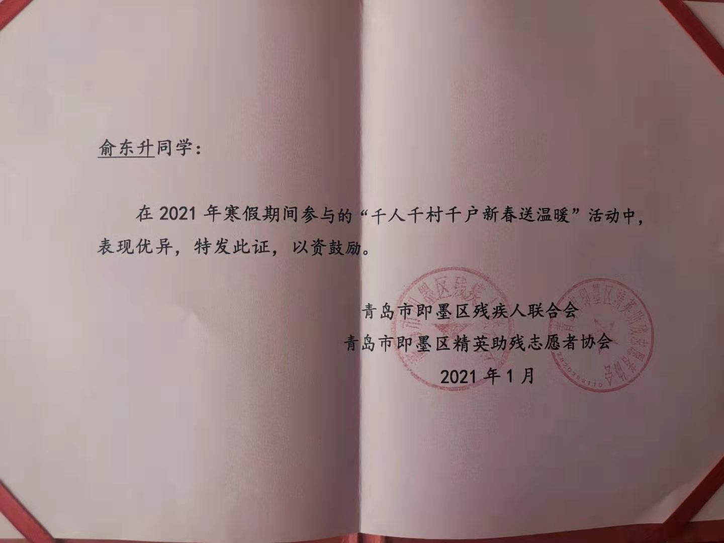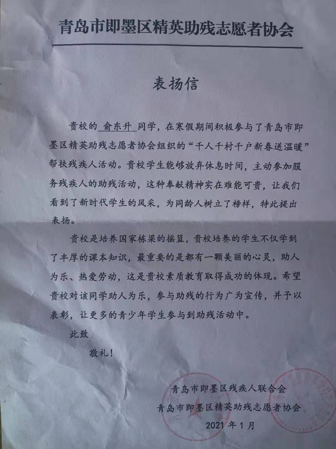 近日,机电工程beplay(中国)收到了来自青岛市即墨区残疾人联合会的表扬信,表扬我院2020级机电一体化技术五班的俞东升同学在寒假期间积极参与了青岛市即墨区精英助残志愿者协会组织的“千人千村千户新春送温暖”帮扶残疾人活动。
