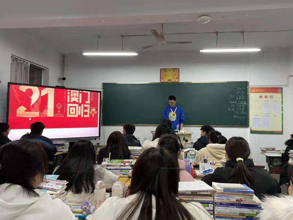 本次团课活动中,各班团支书通过PPT详细介绍了澳门回归之路以及澳门回归祖国后的发展现状,同学们对于祖国的快速发展和不断壮大感到自豪。活动中还设立了知识竞答、时政焦点讨论等互动环节。大家各抒己见,表示作为一名青年大学生,要坚定政治方向,加强自身学习,为祖国发展贡献力量。(房嫚嫚 徐宪供稿)
