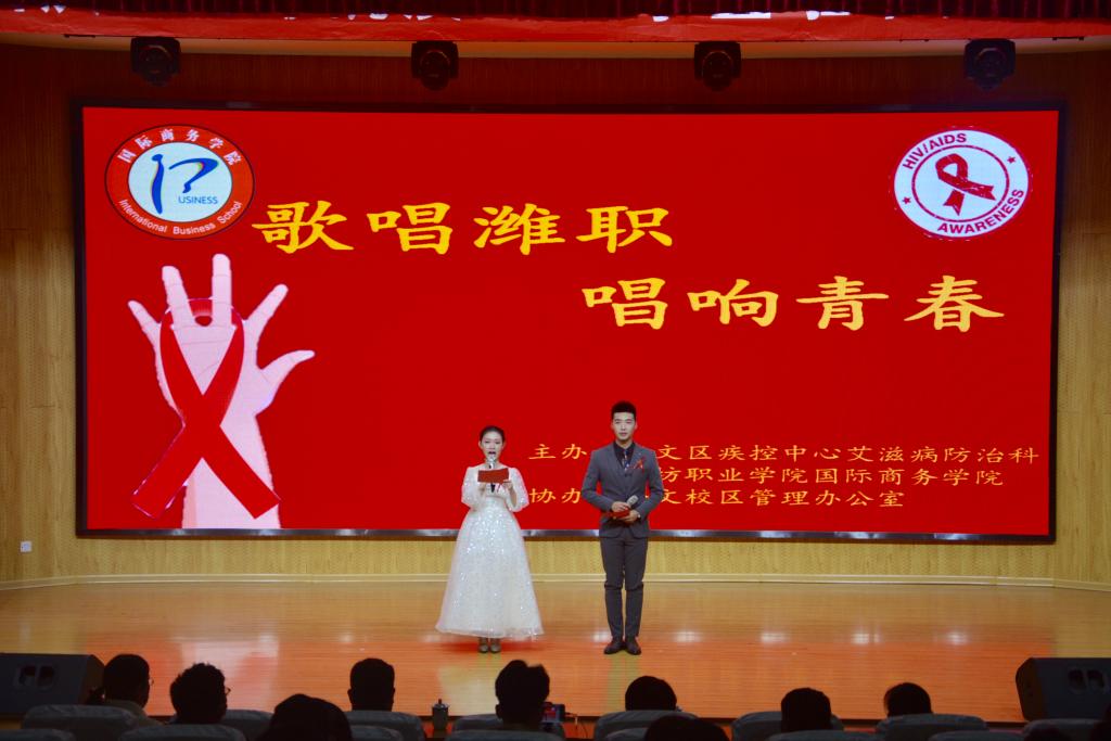 以线下为载体,借助文艺汇演提升活动品质。11月26日下午,以《飘动的红丝带》为开场的“歌唱潍职,唱响青春”文艺汇演暨防疫抗艾知识竞赛现场总决赛在奎文校区16号楼报告厅举行。奎文区疾控中心艾滋病防治科负责人、beplay全站appbeplay全站app首页医疗服务中心负责人、国际商务beplay(中国)分管学生负责人、团总支书记及辅导员担任了评委。根据疫情防控常态化的要求,总决赛采用现场展示和网络直播的形式开展,国际商务beplay(中国)线上线下共计一千余名师生观看了比赛。同学们以歌唱、朗诵、舞蹈等形式,展现了新时代大学生对防疫抗艾的认识和担当,以实际行动参与到防疫抗艾的活动中。