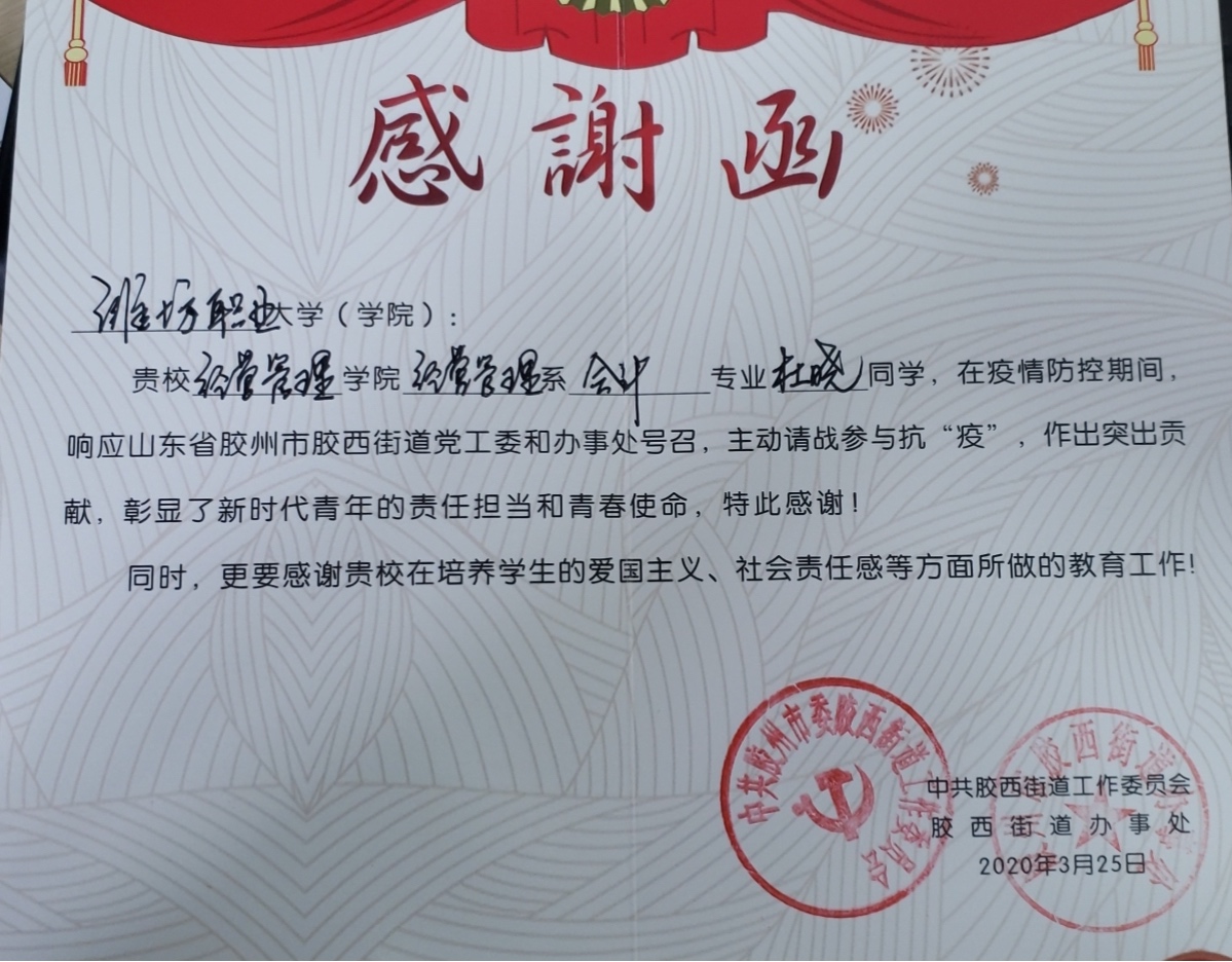 近日,经营管理beplay(中国)收到中共胶州市委胶西街道工作委员会发来的感谢信,感谢我院2018级会计专业7班杜晓同学为疫情防控工作做出的贡献。