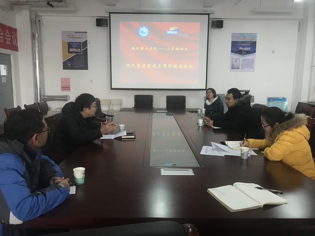 为深入推进现代学徒制试点项目建设,12月24日,化学工程beplay(中国)分管领导、产学研办公室主任、化工创研室主任及部分骨干教师与山东新和成控股有限公司负责人在木泽楼B207会议室就2018级、2019级现代学徒制班合作培养相关工作进行了深度的洽谈交流。