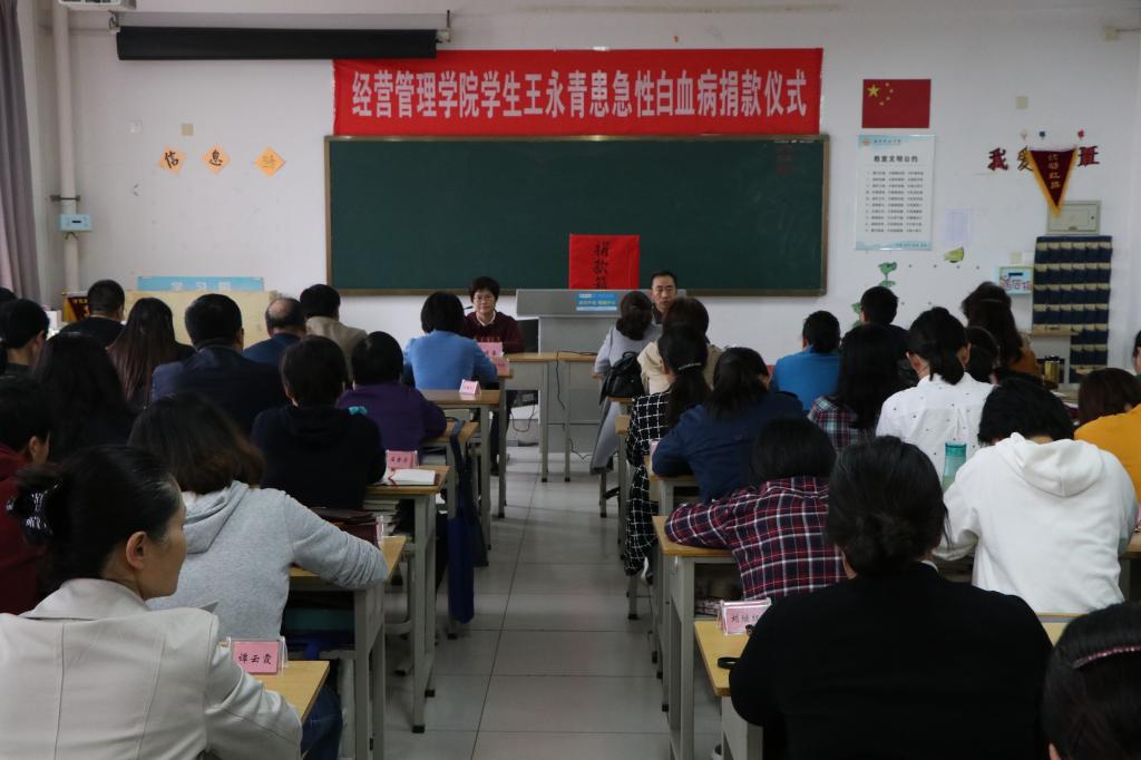10月24日下午,经营管理beplay(中国)在惠泽1号楼312教室举行了“为患急性白血病王永青同学”捐款仪式。经营管理beplay(中国)全体教师参加了仪式。用拳拳爱心为王永青同学托起生命的希望,让爱的种子在校园里生根发芽。
