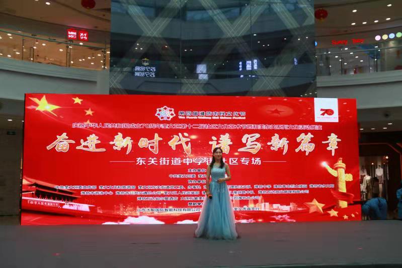 9月27日下午,东关街办中学街社区“奋进新时代,谱写新篇章——庆祝中华人民共和国成立70周年文艺演出”在万达广场中心大厅举行,学生工作处党支部应邀带领学生到社区开展文艺助演。