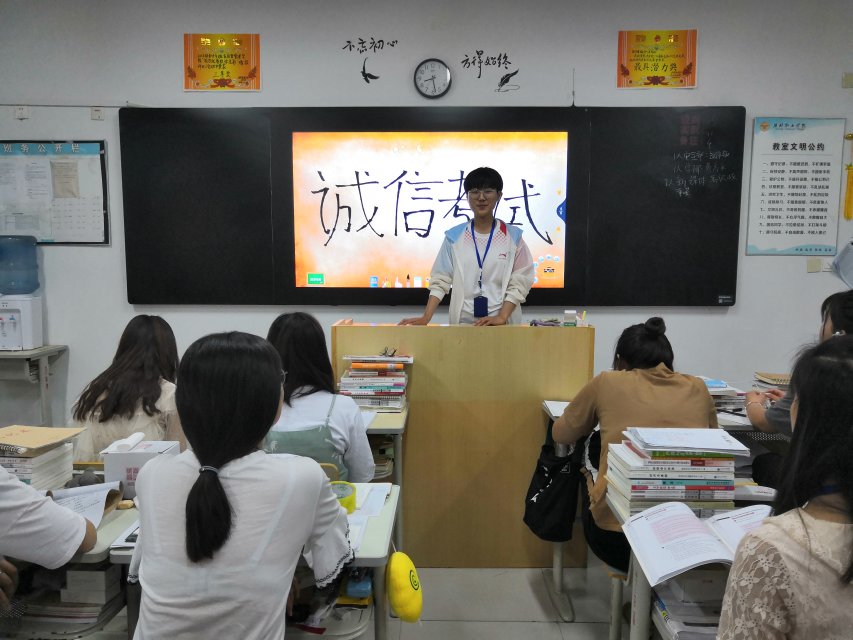 各班召开“诚信考试,从我做起”主题班会。班长组织同学们了解诚信的重要性,从发展前景、日常生活、法律规定等方面举例,生动形象地讲述了何为诚信、诚信应考对当代大学生的意义以及失信行为会引发的不良后果,由此提高了同学们诚信考试的意识,让同学们养成诚信考试、诚信做人做事的良好品质。同学们集体庄重地在诚信考试承诺书上签名,表达了践行诚信考试的决心。