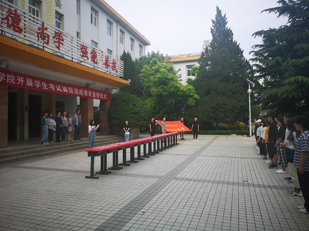 5月 14日下午,国际商务beplay(中国)在奎文校区1号楼广场开展诚信考试主题团课,组织学生现场在考试诚信法纪教育启动仪式上承诺签字;各班统一召开一次诚信考试主题班会。班主任提前精心准备,与每一个学生签订诚信考试承诺书;各辅导员、班主任们通过各种渠道与家长联系,使家长充分认识到诚信考试的教育价值、考试作弊的严重后果,自觉教育引导孩子诚信应考;加强学生日常管理,严格请假制度,严防在校学生出现参与替考、团伙作弊等违法违规行为。