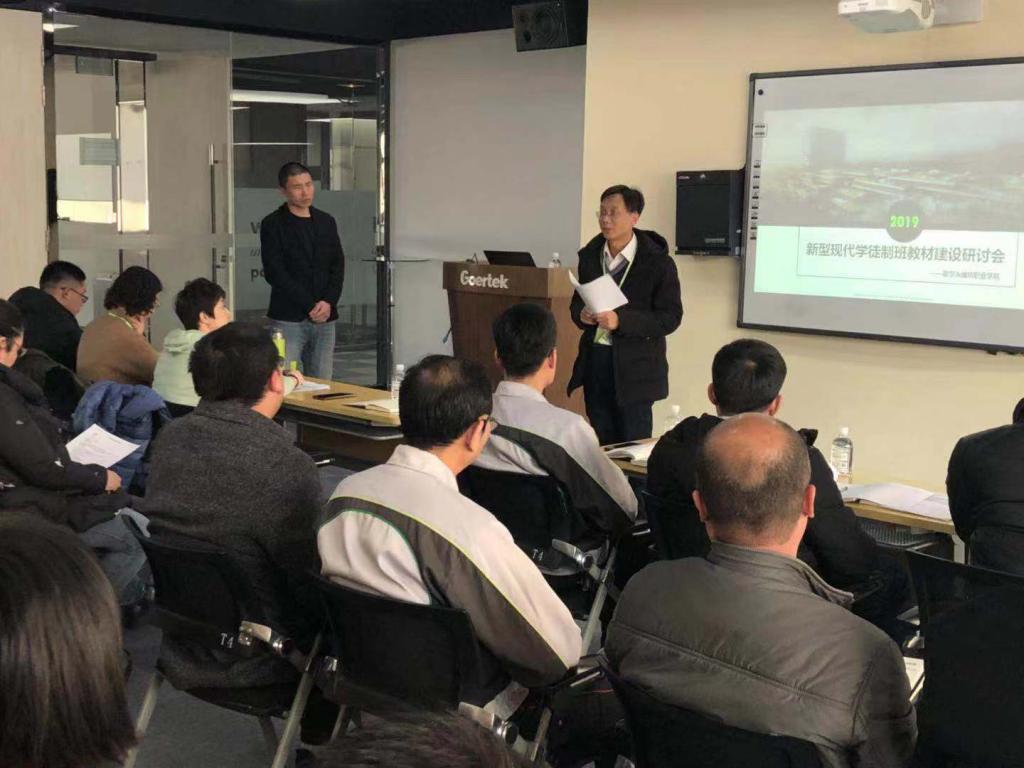 会上,由企业技术专家组成的教材建设团队与我院专业教师针对专业课程特点和新型现代学徒制班企业学习环境等情况进行了深入交流,并根据技术领域和职业岗位的任职要求切磋探讨了新型现代学徒制班级课程设置、教学标准、教材编撰等相关事宜。