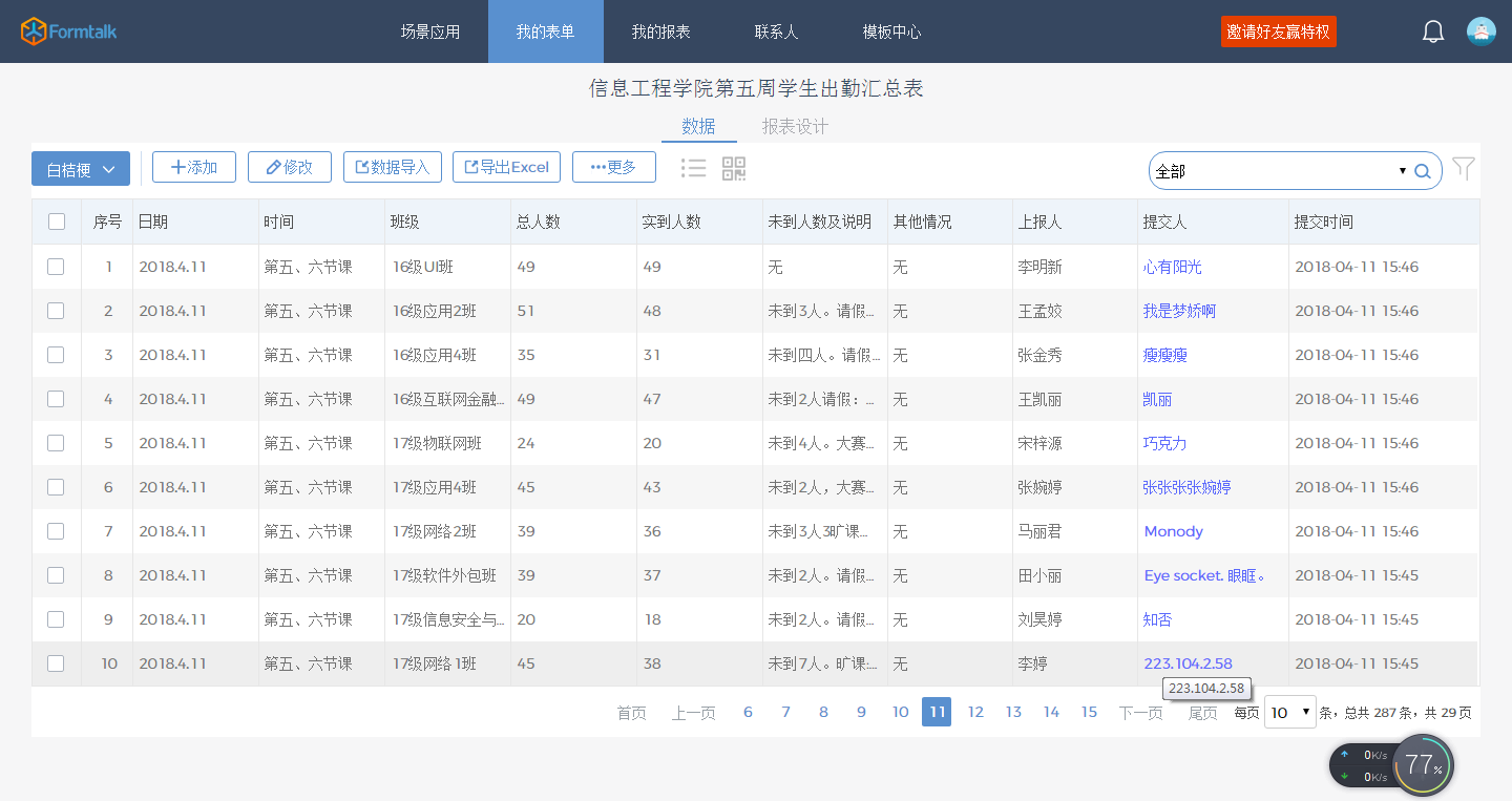 为提高学生管理工作水平,近期,信息工程beplay(中国)推出formtalk平台,进一步完善学生考勤管理。