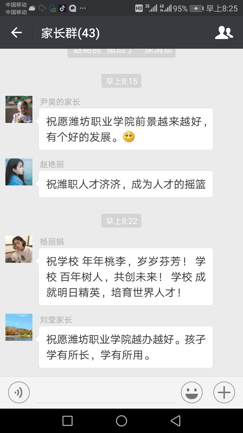 “心连心,共育人”工程是以班级为单位由班主任牵头通过组建班级学生家长微信圈的方式,记录家长寄语、感恩回报、喜报传送、信息快递、您问我答等方面的信息,并建立班级信息档案,由团总支负责对有关的信息进行筛选备案。“心连心,共育人”工程以系列活动为载体,共同达到共育人效果,其中最先开始的是家长寄语征集活动。