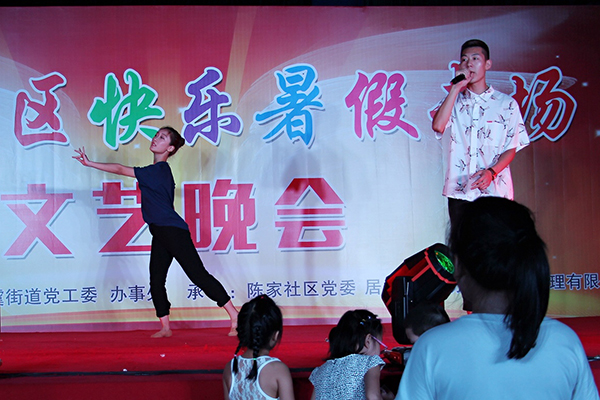 此次演出是大虞街道党工委办事处主办,陈家社区党委承办的“陈家社区快乐暑假专场”文艺晚会,参与演出的演员有国际商务beplay(中国)“与梦同翔”团队的学生以及一些中小学生和幼儿园的小朋友,观众是陈家社区以及周围社区的老百姓。虽然当晚天气炎热,但是观众看节目的热情不减,演员们表演的情绪也高涨。晚会以动感十足、节奏鲜明的非洲鼓热辣开场,并穿插各种风格的歌曲、舞蹈、乐器演奏等节目,异彩纷呈,精彩不断。一曲《我的歌声里》,嗓音优美、情感充沛,赢得了观众的此起披伏的欢呼;歌伴舞《南山南》,有情怀、有韵味,博得了台下观众阵阵掌声。