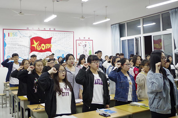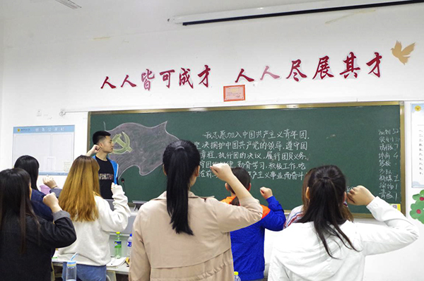 活动中,团员们面对鲜红的团旗,高举右拳,庄严地宣誓:“我志愿加入中国共产主义青年团……为共产主义事业而奋斗!”每位团员表情庄严肃穆,铮铮誓词在教室内回荡,铿锵有力。优秀团员代表在发言中表达了对优秀共青团员的认识,号召大家以团歌为号召、以团旗为标杆、以团徽为荣耀,坚守承诺,以实际行动争做有理想、有追求、有担当、有作为、有品质、有修养的优秀共青团员。