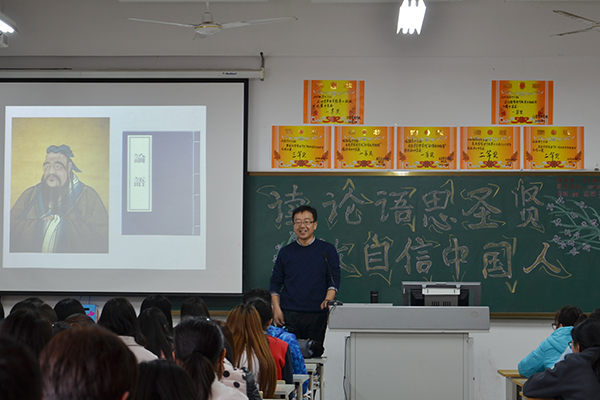 本次讲座的主题是“读《论语》,思圣贤,做自信的中国人”,由beplay(中国)思想政治教学部史海亮老师主讲。史老师以习总书记提出的“四个自信”为切入点,以中华传统文化的萌芽发展为出发点,以解读孔子高尚的品质和《论语》中的经典篇目为主线,从孔子出身、兴趣爱好、仕途经历讲起,通过孔子的人生经历让学生明白勤奋、钻研、吃苦才会成才,并鼓励同学们通过阅读《论语》深刻领悟其精髓,更好地做人做事。讲座深入浅出,富有哲理,现场反响热烈。