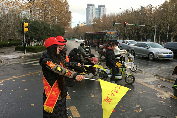 在晚高峰时段,志愿者们头戴红色志愿者帽,手持文明交通旗帜,来到交通主干道上人流量大的十字路口开展了文明交通劝导志愿者活动,劝导行人不闯红灯、不乱穿马路,遵守交通规则。志愿者们通过实际行动,让更多市民减少不文明交通陋习,文明行车,安全出行。活动过程中,志愿者每一句温馨的话,一个小小的指挥动作,都让市民感到分外亲切。每逢遇到上了年纪的老人,志愿者们还会主动搀扶他们安全走过斑马线。