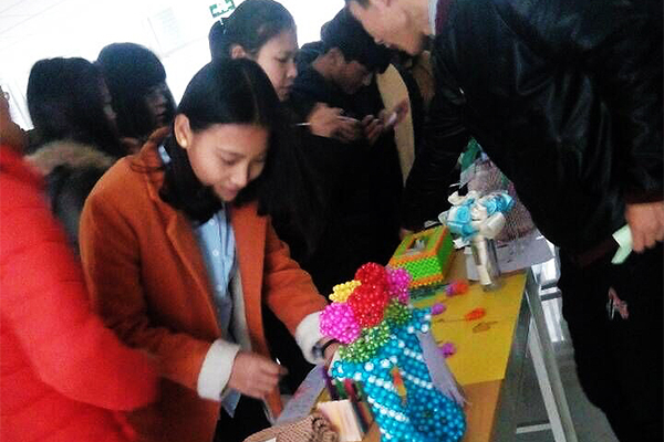 参赛作品种类繁多,有布艺、纸艺、编织、建筑模型,赏心悦目的花瓶珠花、翩翩起舞的蓝色孔雀等,一件件别具匠心的手工艺品令人赞叹不绝。展出的手工艺品吸引了众多师生驻足观看。经过投票,评选出一等奖二名、二等奖四名、三等奖六名及优秀奖若干名。(于囡囡供稿)