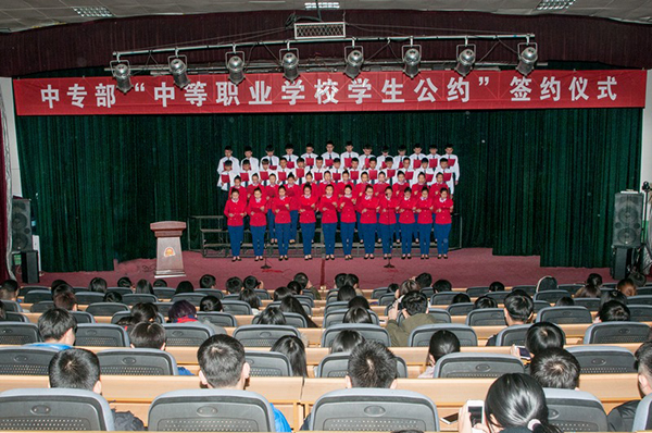 为培育和践行社会主义核心价值观,引导中职生养成良好行为习惯,11月26日,中专部举行中等职业学校学生公约签约仪式,2015级中职学生代表参加。