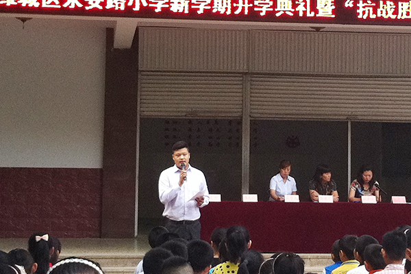 9月2日下午,我院学生“清韵悠扬诵读演讲协会”成员应邀参加潍城区永安路小学新学期开学典礼暨抗战胜利70周年纪念活动启动仪式,为该小学3000名师生作了题为“历史·未来”的演讲。演讲内容以“铭记历史、缅怀先烈、珍爱和平、开创未来”为主题,围绕抗日战争历史,结合抗战英烈历史事迹,讲述了一名抗战老红军的抗日故事,让师生进一步了解了中国人民抗日战争的历史,深刻体验了以爱国主义为核心的伟大民族精神。(王学强 郭冕供稿)