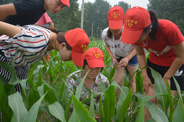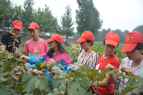 实践团队在指导老师的带领下,与峡山生态经济发展区郑公街道潘刘屯村包村“第一书记”安守强同志对接,随村主任等工作人员和部分农户一起深入田间地头,了解当地农业生产和农村经济发展现状。师生通过对当地的村容村貌、人员结构、气候、土壤、生态环境及交通等特点的了解,和村委工作人员一起分析了当地发展中存在的问题、发展生态农业的有利条件,并提出了发展生态旅游农业的设想。同时青年志愿者们在我院农业生产专家席敦芹教授的指导下,对玉米、酿酒葡萄的生长进行了观察,席教授耐心细致的指导青年志愿者们识别玉米生长常见病虫害、辨别酿酒葡萄与食用葡萄的不同,通过对比不同田地的葡萄生长状况,让同学们认识到了精细化管理的重要性。