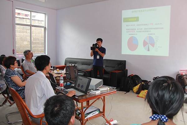 围绕“互联网+”环境下农村信息化建设主题,实践团主要开展了电子商务知识讲座、网店开设和后期网店经营维护等活动。在听取了水润道村负责人对当地体情况的介绍后,实践团指导老师就如何打好生态牌、打造地理标志产品、尽快做好绿色认证和品牌商标注册等进行了深入探讨,并给出了积极合理建议。实践团邱兴泉老师结合淘宝、京东等大型电商网络平台的发展动向,为当地村干部、旅游公司负责人、养殖场场长和农业种植大户分析介绍了农村电子商务发展的现状和未来趋势,并以当地正大量上市的桃子等农产品为例演示讲解了网上开店的具体操作流程和注意事项。随后,实践团师生冒着炎炎烈日到田间地头收集开设网店所需的第一手资料。