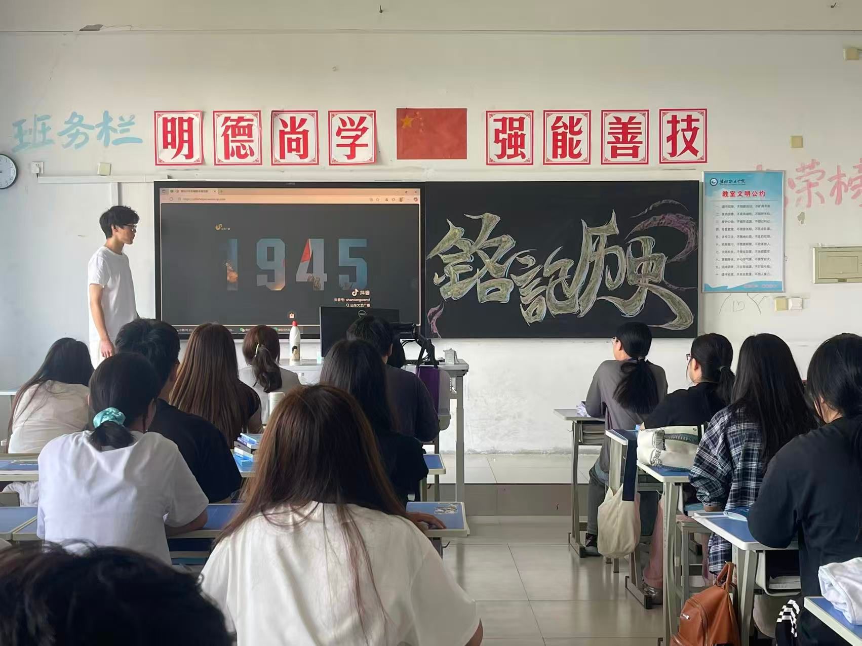 活动中,各班团支书借助历史纪录片及图文史料,生动还原了80年前那段波澜壮阔的历史。团支书们重点讲述了中国在反法西斯战争中作出的卓越贡献,通过分享杨靖宇、赵一曼等抗日英雄抛头颅、洒热血的感人事迹,深刻阐释了“正义必胜、和平必胜、人民必胜”的历史真理,让同学们深刻体会到今日和平生活的来之不易,进一步增强了对国家历史的认同感与民族自豪感,夯实了爱国主义思想根基。此外,同学们结合身边的红色故事、历史纪念活动经历,畅谈自己对“爱国”的理解,大家纷纷表示要从历史中汲取奋进力量,明确青春担当方向,营造“以史明志、砥砺前行”的浓厚氛围。