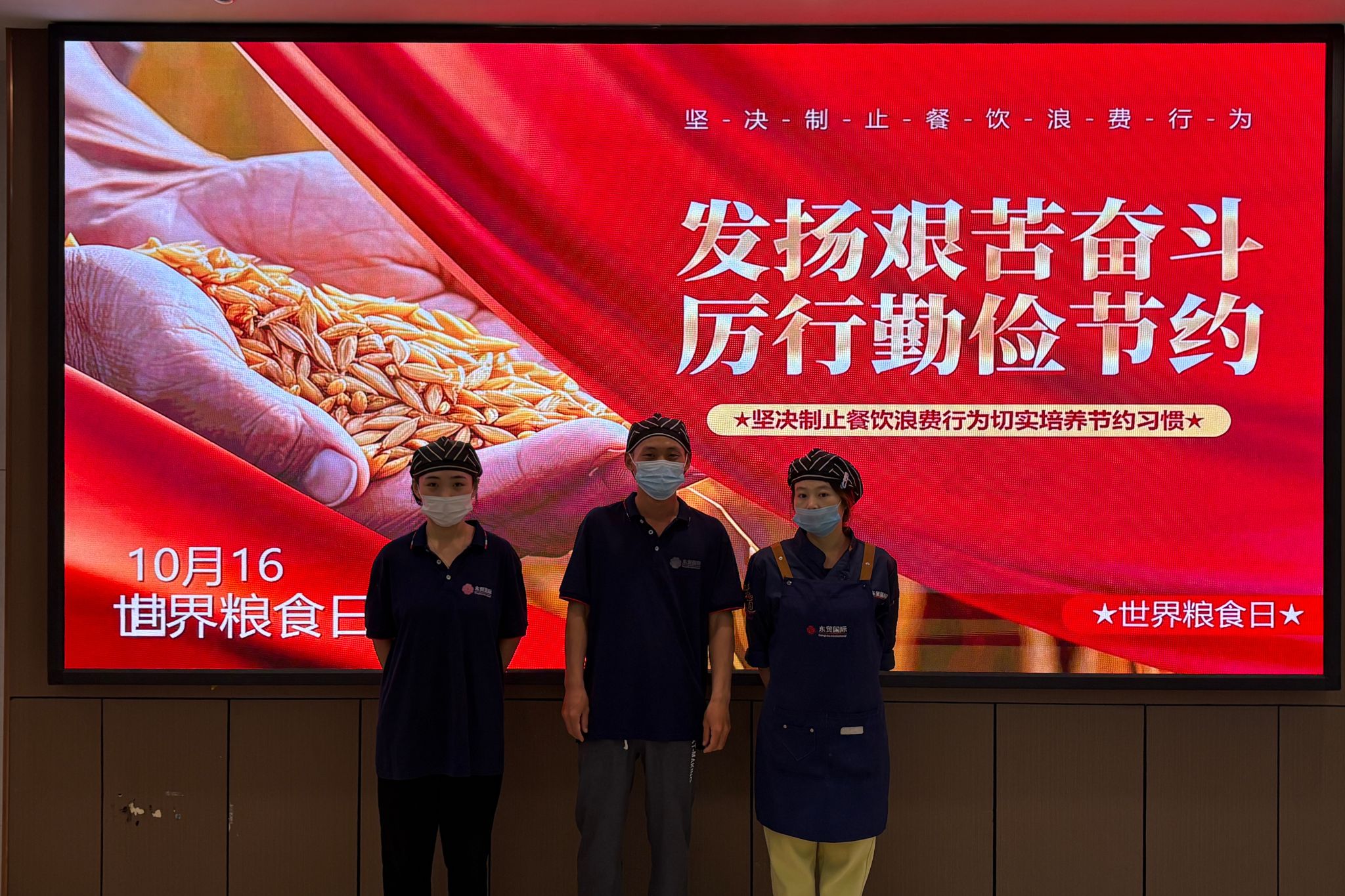 饮食服务中心精心筹划,在各校区食堂显著位置布置了“世界粮食日”主题宣传内容。通过电子屏滚动播放宣传标语、学生食堂餐桌张贴温馨提示、教职工食堂墙面设置醒目标语等方式,营造出了浓厚的节粮宣传氛围。