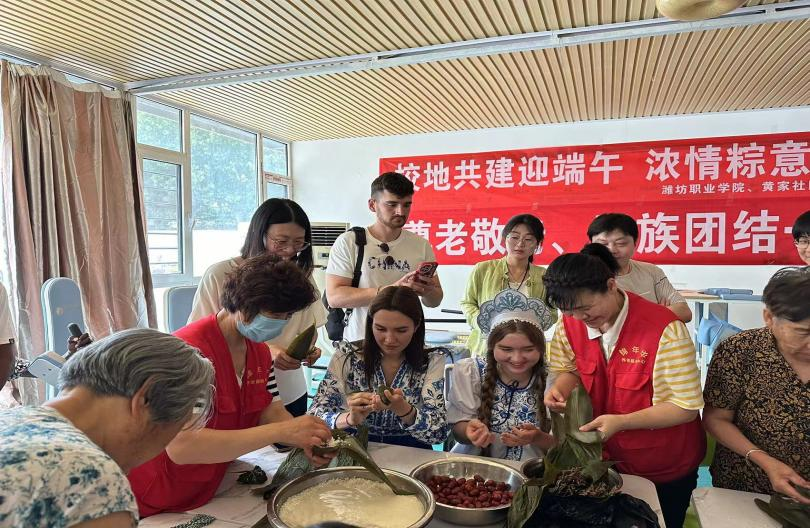 6月6日下午,beplay(中国)联合奎文区潍州路街道黄家社区共同开展“校地共建迎端午 浓情粽意暖民心”端午节特别活动。来自加纳、俄罗斯、巴基斯坦等国家的21名留学生来到黄家社区锦年华养老服务中心参与活动。