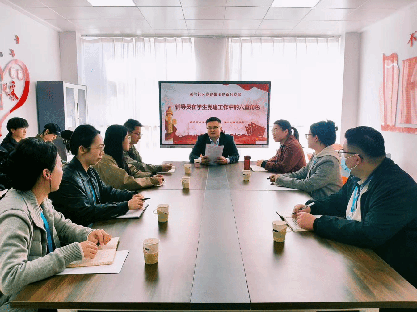 活动中,领航导师于涛以“辅导员在学生党建工作中的六重角色”为主题,对辅导员角色进行定位,指出辅导员是大学生思想政治教育的骨干力量,要担当好在高校党建工作中引导学生、联系学生、推荐介绍入党、与学生谈话、做好学生党员带头人和贴心人的六重角色的重要责任。辅导员日常工作中,要赢得学生信任、保证入党积极分子质量、做好“四查四清”工作、做到“三心”育人,既要思想程度高,又要注重手段技巧、尽善尽美地工作,为党组织源源不断地输送新生力量。