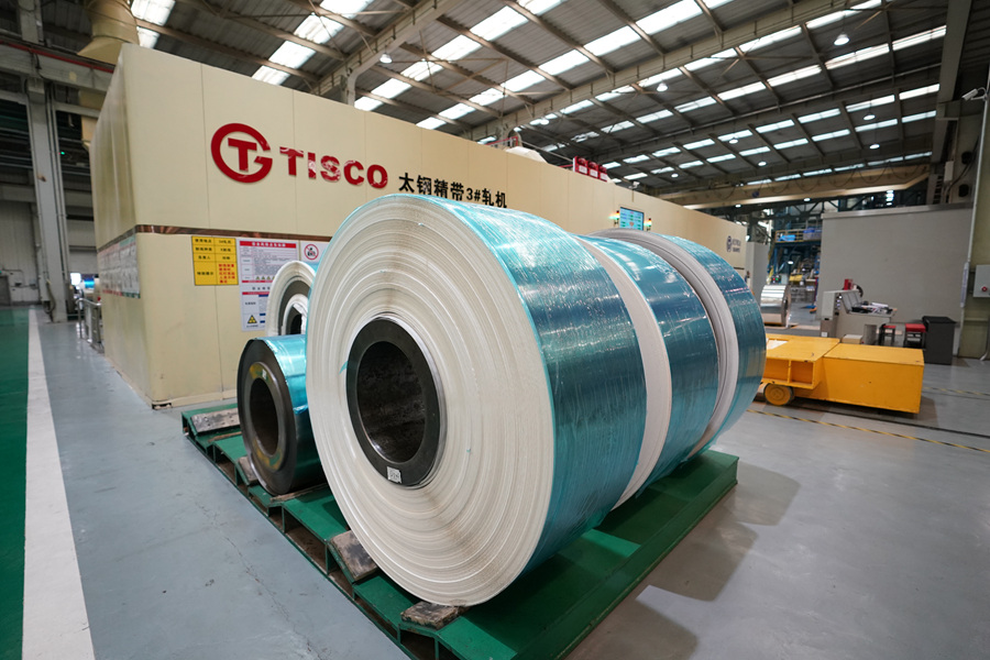 这是2023年10月24日拍摄的中国宝武山西太钢不锈钢精密带钢有限公司车间一角。一卷卷超薄“手撕钢”产品摆放在车间内。新华社记者 詹彦 摄